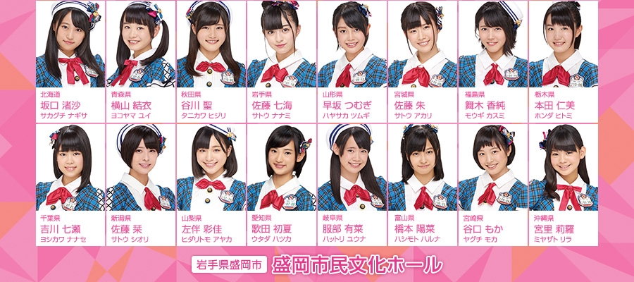 坂口渚沙(北海道)/横山結衣(青森県)/谷川聖(秋田県)/佐藤七海(岩手県)/早坂つむぎ(山形県)/佐藤朱(宮城県)/舞木香純(福島県)/本田仁美(栃木県)/吉川七瀬(千葉県)/佐藤栞(新潟県)/左伴彩佳(山梨県)/歌田初夏(愛知県)/服部有菜(岐阜県)/橋本陽菜(富山県)/谷口もか(宮崎県)/宮里莉羅(沖縄県)