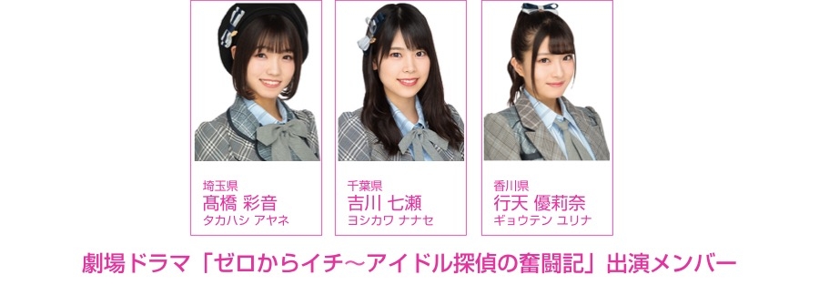 「Jumping Time」に続き上演される、新たな劇場型ドラマ「ゼロからイチ〜アイドル探偵の奮闘記」に、AKB48チーム8から、埼玉県代表・髙橋彩音、千葉県代表・吉川七瀬、香川県代表・行天優莉奈の3人が出演することが決定しました!
