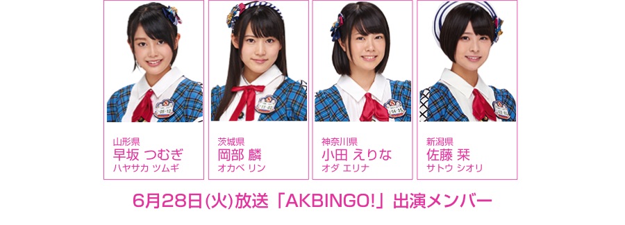 6月28日(火)放送の日本テレビ系「AKBINGO!」(毎週火曜日24:59〜放送 ※一部地域を除く)は、「新MC登場SP」! チーム8から、山形県代表・早坂つむぎ(ハヤサカ ツムギ)、茨城県代表・岡部麟(オカベ リン)、神奈川県代表・小田えりな(オダ エリナ)、新潟県代表・佐藤栞(サトウ シオリ)が参加しています。