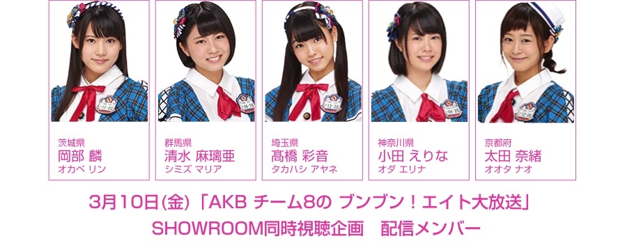 3月10日(金)25:50から日本テレビで放送するAKB48チーム8初の地上波冠番組「AKB チーム8の ブンブン!エイト大放送」第7回も、SHOWROOM同時視聴企画を実施することが決定しました!