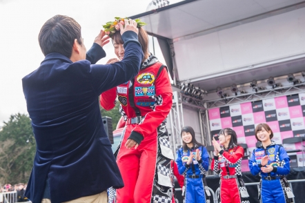 決勝レースはトーナメント方式で行われ、1回戦から白熱の展開に。ほとんどのメンバーが25秒前後という好タイムで拮抗する中、AKB48 Mobileの事前予想でも上位にランクインしていた新潟県代表・佐藤栞(サトウ シオリ)、京都府代表・太田奈緒(オオタ ナオ)らが2回戦へと順当に勝ち進みました。2回戦では、1回戦よりさらにタイムを縮めた神奈川県代表・小田えりな(オダ エリナ)、熊本県代表・倉野尾成美(クラノオ ナルミ)が大健闘を見せて勝ち進むも、3回戦は、20秒台を叩き出した佐藤栞、太田奈緒に1歩及ばず。最後は、この2人の一騎打ちとなり、19秒62という、まさに"初代最速女王"の名にふさわしい記録で、太田奈緒が優勝を飾りました。この勝利によって、太田奈緒は、5月4日(木・祝)開催の〈2017 AUTOBACS SUPER GT Round 2 FUJI GT 500km RACE 決勝〉でゴールフラッグマーシャルを務める権利を獲得しました。また予選を含めて活躍した、千葉県代表・吉川七瀬(ヨシカワ ナナセ)、山梨県代表・左伴彩佳(ヒダリトモ アヤカ)、富山県代表・橋本陽菜(ハシモト ハルナ)、宮崎県代表・谷口もか(ヤグチ モカ)には「グッドイヤーレーシング平中賞」が、高知県代表・廣瀬なつき(ヒロセ ナツキ)には「くま吉&ルーキー賞」が授与され、「クルマの楽しさを伝える」というイベントの趣旨にのっとり、楽しいレースを繰り広げたチーム8メンバーに、盛大な拍手が送られました。